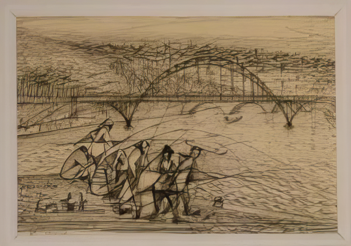 While in Paris, Brzosko also began to work on sketches for his extensive composition commemorating the Warsaw ghetto uprising of 1943. These drawings are generally small and stylistically quite different from his finished "Warsaw Ghetto Series" canvases and preparatory sketches. Only a small number of Brzosko's pre-Paris works have survived. They consists mostly of marine landscapes from the Polish coast around the Sopot area. Most of his early work either perished during World War II or was left behind in haste, when he left Poland in 1956.
